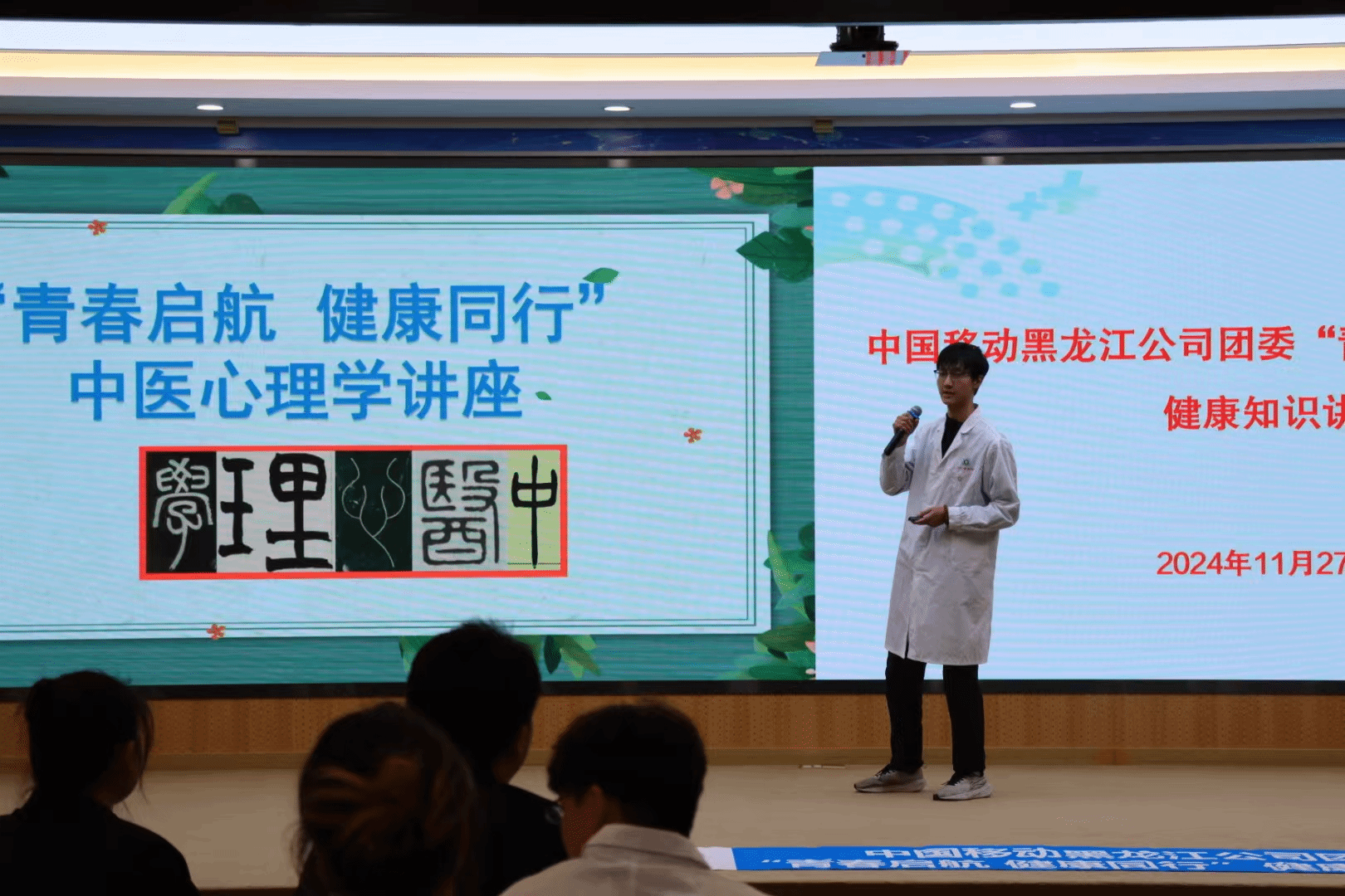 11月27日,人文与管理学院组织该院应用心理学专业志愿者赴中国移动黑龙江公司开展“青春启航 健康同行”中医心理学健康知识讲座,通过中医心理学“五行人”理论讲座、心理学“自画像”、音乐疗法、八段锦等传播健康知识,促进群众身心健康。