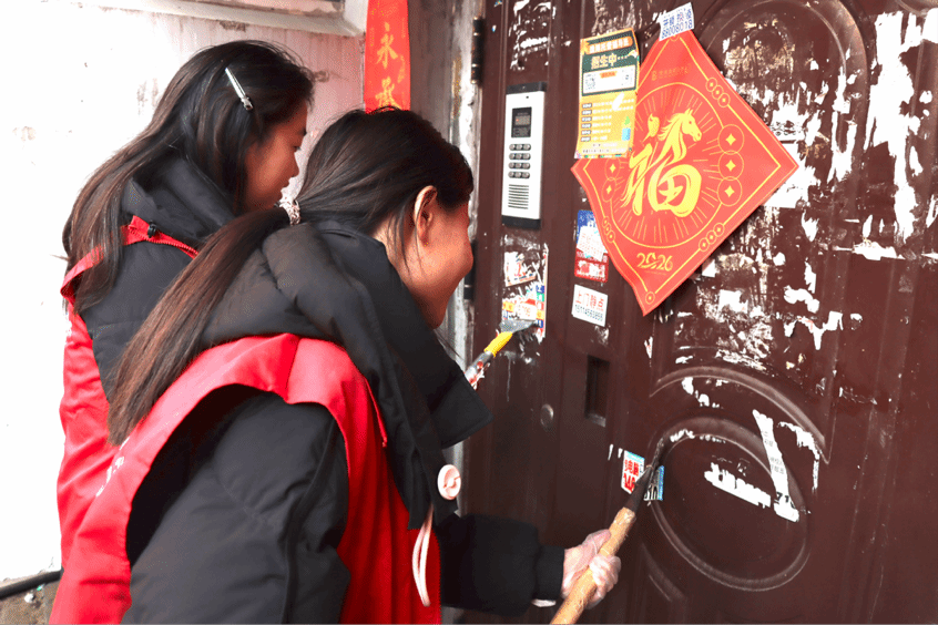 志愿者对社区居民楼单元门上的非法小广告进行集中铲除,同时深入对社区楼道墙面、电线杆等处进行清理,以志愿力量为社区墙面“减负美颜”。