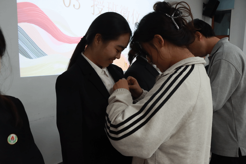 辅导员为“志行班”学员佩戴班徽